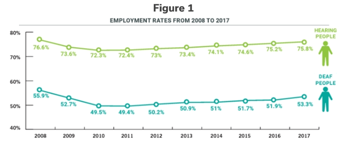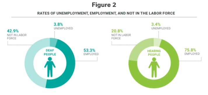 The National Deaf Center on Postsecondary Outcomes reports that only 56% of adults with hearing loss or deafness were employed, compared to nearly 73% of hearing adults [updated with 2023 data since original publication of this blog]. (See Figure 1 for 2017 data.) In addition, 41% of people who were deaf, compared to 24% of hearing people [2023 data], were not even in the labor force. (See Figure 2 for 2017 data.) However, they were also more likely to be actively looking for work, suggesting that they were not opting out of the workforce because of a lack of interest, but rather, a lack of options and access.